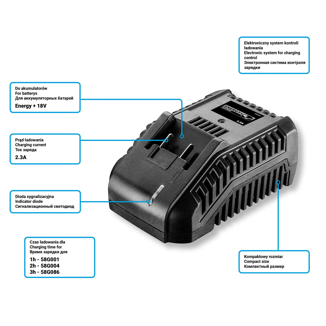 Akkutöltő a GRAPHITE Energy+ 18V, Li-Ion, akkumulátorokhoz, maximális töltőáram 2.3A, az 58G001 akkumulátor töltési ideje 1 óra, az 58G004 akkumulátor töltési ideje 2 óra. Jól olvasható dióda jelzi rácsatlakoztatott feszültséget, a töltés folyamatát vagy a töltés befejezését. Feszültség és hőmérséklet felügyelő rendszerrel rendelkezik az akkumulátor és a felhasználó teljes védelme érdekében.