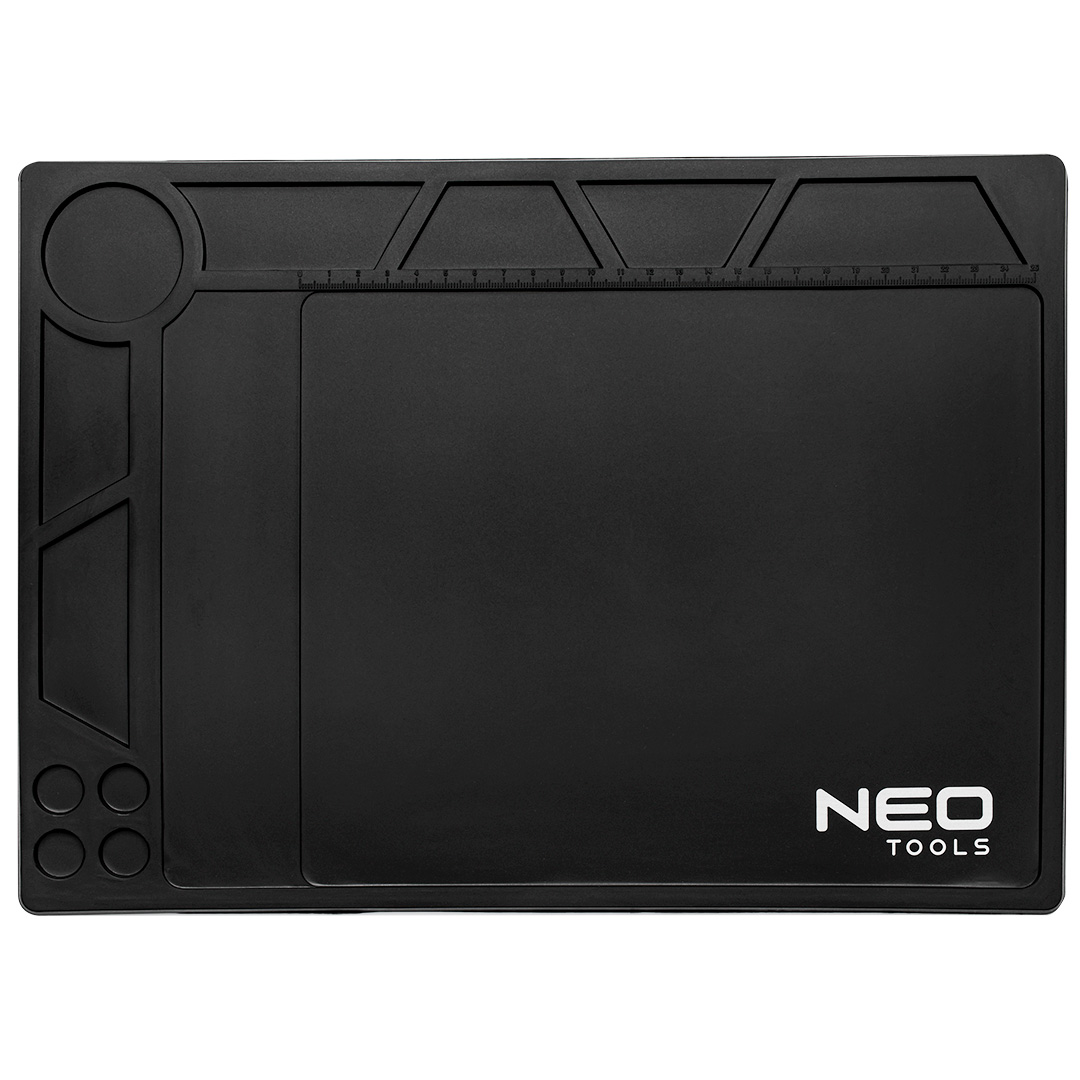 A 359 x 260 x 5 mm méretű NEO antisztatikus szőnyeg okostelefonok, táblagépek és laptopok szervizeléséhez használható. Elsősorban elektronikai mérnököknek és az ilyen jellegű munkával hivatásszerűen foglalkozó személyeknek szól. A szőnyeg szilikonból készült. Lehetővé teszi a munka közbeni rend fenntartását. Antisztatikus felületet is biztosít. A szélein további válaszfalakkal rendelkezik, amelyekben a szervizeléshez szükséges elemek elhelyezhetők. A szőnyeg 300°C-ig (közvetlen érintkezés esetén 230°C-ig) ellenáll a hőmérsékletnek.