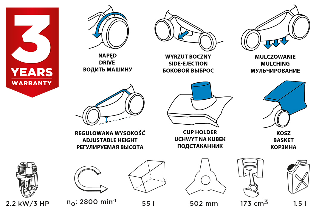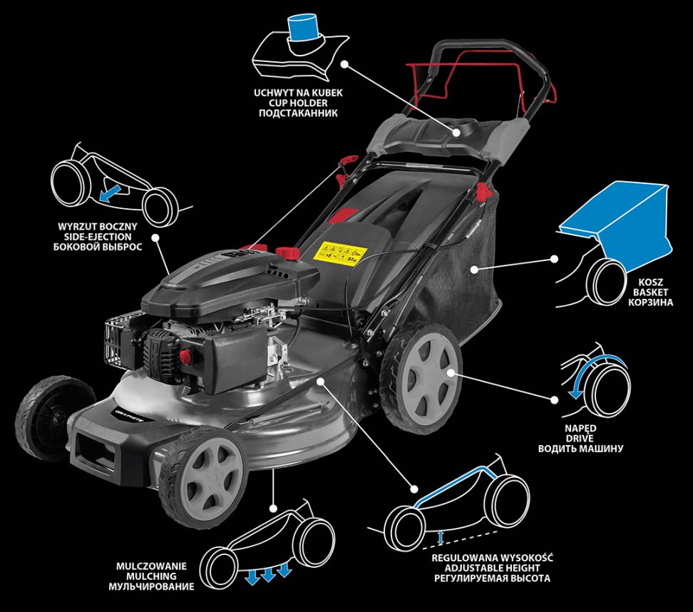Benzines fűnyíró hajtással GRAPHITE (ref 52G672) hatalommal 4 KM fűnyírásra tervezték a nagy kertben. A készülék 5 fokos vágási magassággal van felszerelve, 25 és 65 mm között. Kosár kapacitással 55 l összegyűjti a kaszált füvet, ezzel megtakarítva a gereblyézés és begyűjtés munkáját. Ezenkívül a készülék lehetővé teszi az oldalsó kisülést és a talajtakarást. A kaszaszélesség 502 mm.