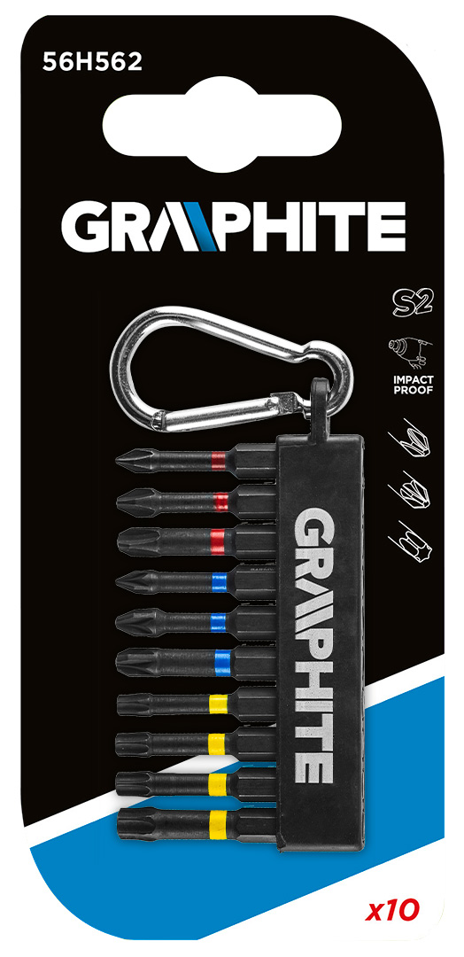 GRAPHITE torziós bitkészlet (ref. 56H562) 10db-os. PH1/2/3, PZ1/2/3, TX25/27/30/40, teljes hossz 50 mm . Ezek tartós bitek, amelyeket nagy nyomatékú gépekkel vagy ütvecsavarozókkal történő munkához terveztek. Kiváló minőségű S2 acélból készülnek, amelyet fokozott rugalmasság és a mechanikai sérülésekkel szembeni ellenállás jellemez. A nagy nyomaték hatására forgó torziós zóna csökkenti a feszültséget ami ellenállóbbá teszi a bitet töréssel szemben így élettartama lényegesen hosszabb lesz. A hegy csúcspontja tökéletes illeszkedést garantál. Karabinerrel az övhurokhoz való rögzítéshez. A GRAPHITE márka a professzionális igényeket kielégítő elektromos szerszámok és tartozékok széles választékát kínálja.