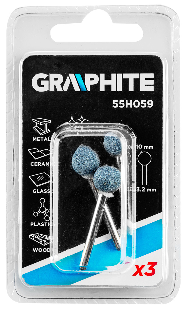 Csapos köszörűkő GRAPHITE (ref. 55H059) alakú golyó átmérőjű 10 mm. A készlet tartalmazza 3 db. Mini darálóval való használatra szánják őket. Az őrlőkő alumínium-oxidból készül. Alkalmas a legtöbb anyag élesítésére, simítására, sorjázására és általános csiszolására. Feldolgozásra használhatók: fémek, öntvények, hegesztett kötések, szegecsek, rozsda eltávolítása, kerámia, üveg, fa, műanyag.