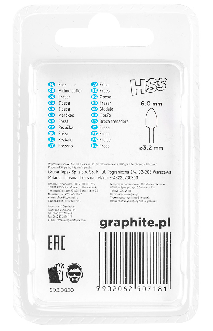 HSS maró GRAPHITE (ref. 55H061) alakú lövedék átmérőjű 6.0 mm. A készlet tartalmazza 2 db. Mini darálóval való használatra szánják őket. Alkalmas különféle anyagokból készült furatok alakítására, vájására, hornyolására, vésésére. Használható fémek, műanyagok, üvegszál és fa számára.