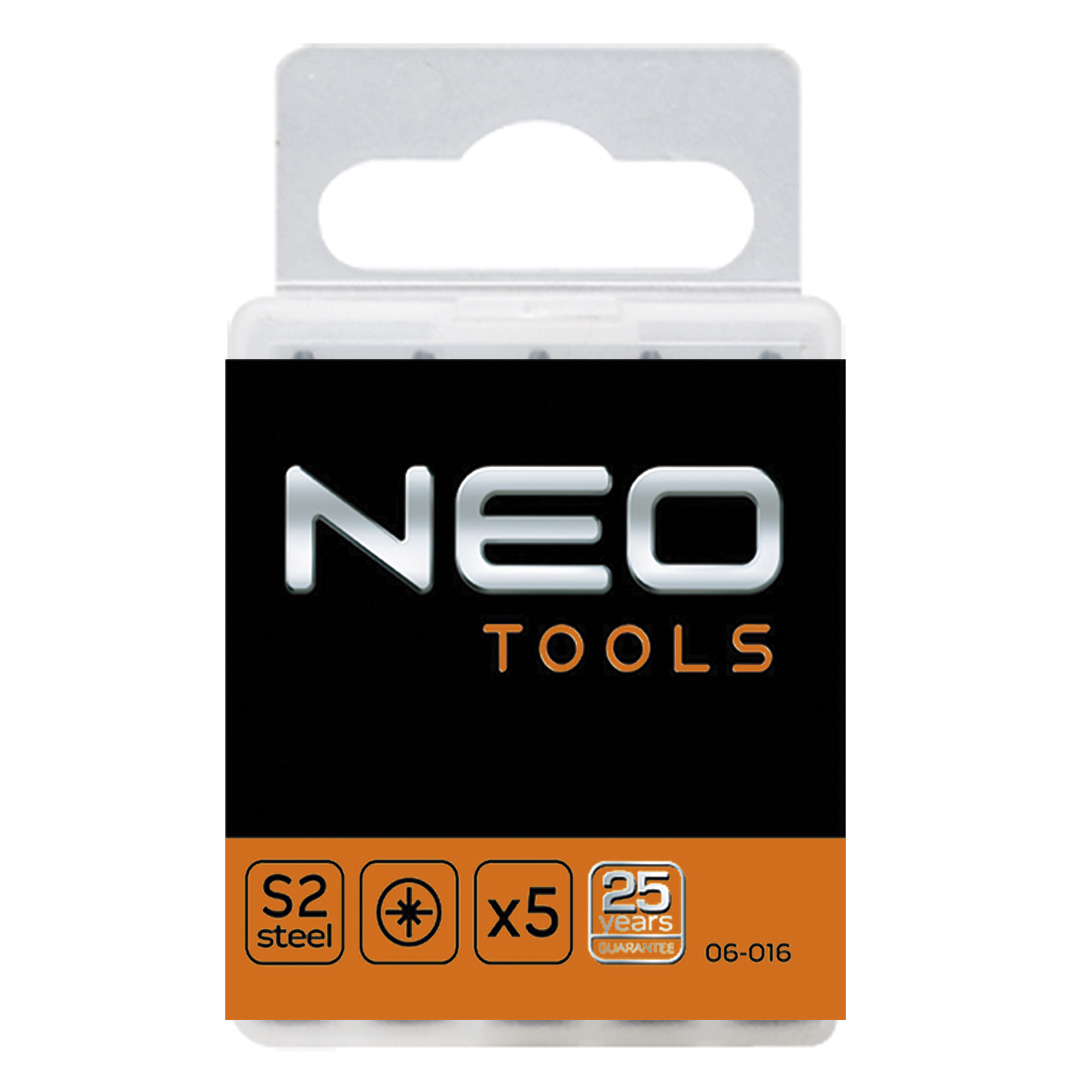 NEO PZ2 1/4″ csavarhúzó bitek, hosszuk 25 mm. Az alkalmazott S2 acélötvözetnek köszönhetően a hegyek keménysége eléri a 60 HRC értéket, ami jelentősen megnöveli élettartamukat és a velük végzett munka minőségét. A DIN 3126 szabványnak megfelelő kivitelben. A szerszám minőségét bizonyítja a gyártó által nyújtott 25 éves jótállás. A NEO márka a professzionális igényeket is kielégíti.