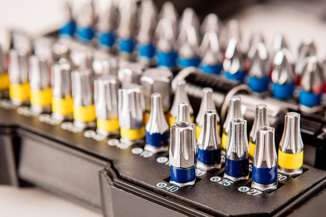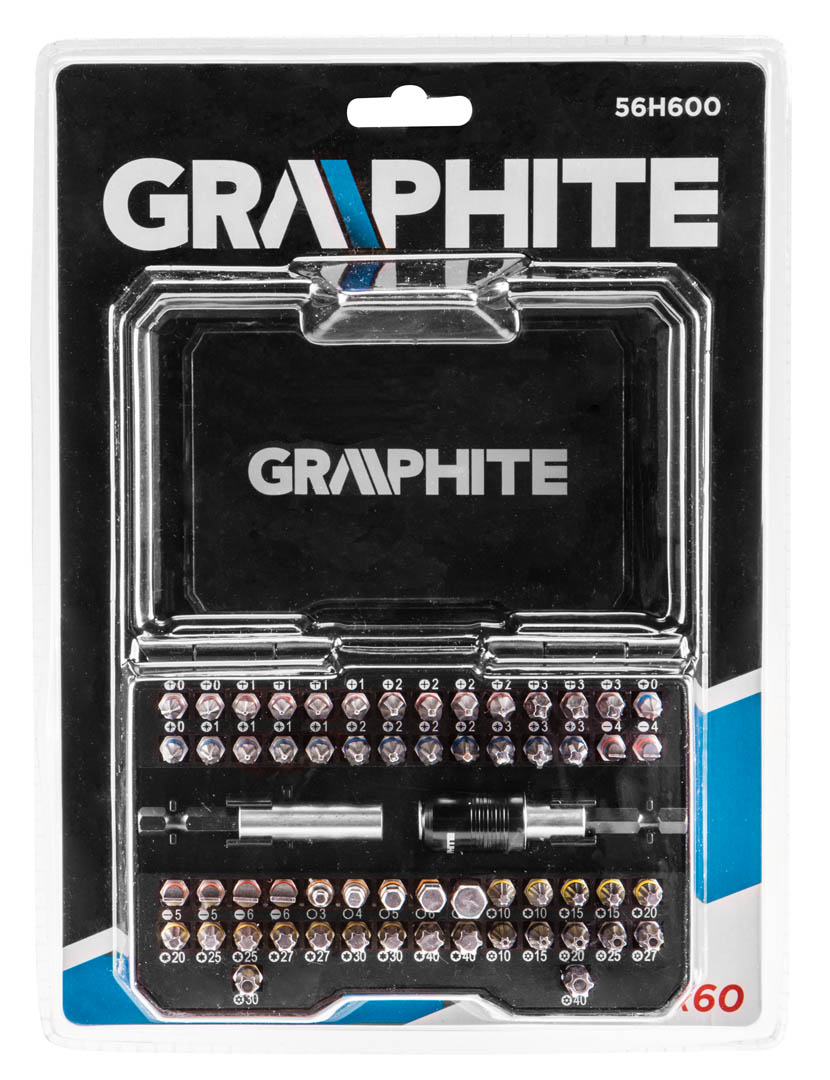 GRAPHITE Nagy, univerzális csavarbehajtó bit készlet (kat.sz. 56H600), a csavarbehajtáshoz szükséges különböző típusú biteket tartalmazza. A leggyakrabban használt méretek (PH2, PZ2 ..) többször megismételve.