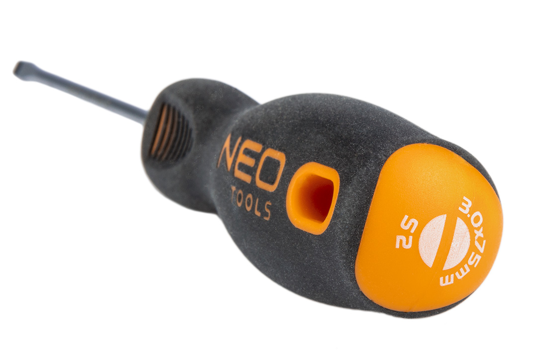 NEO lapos csavarhúzó. A csavarhúzó szára kivételesen ellenálló S2. A csavarhúzó hegy hőkezelésnek lett alávetve, így megfelelő, 56 HRC keménységet és hajlítószilárdságot ért el. A csavarhúzó hegye mágneses. A markolat három élű hasáb alakja a kialakított hüvelyktámasszal csökkenti a kéz megterhelését munka közben, és megkönnyíti a megfelelő forgatónyomaték elérését. A bimateriál markolat nem csúszik ki a kézből, ellenálló vegyszerek, kenőolajok és zsírok hatásának. A szerszám minőségét bizonyítja a TÜV tanúsítvány és a gyártó által nyújtott 25 éves jótállás. A NEO márka a professzionális igényeket is kielégíti.