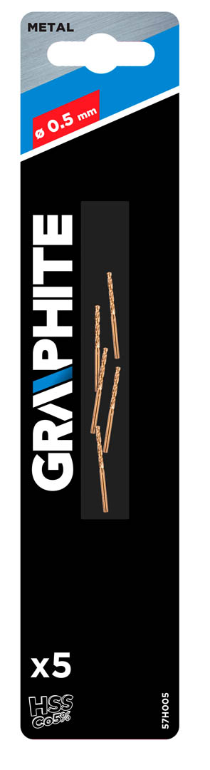 A fémfúrószárak GRAPHITE (kat.sz. 57H005) átmérővel 0.5 mm kiváló minőségű 5% kobalttal adalékolt M35-ös gyorsvágó acél ötvözetből készülnek. A 135°-os csúcsszög és a kikönnyített keresztél könnyű fúráskezdést biztosít, pontozó használata nélkül is. Az ötvözet ellenálló-képessége a magas hőmérsékleteknek alkalmassá teszi a nehezen megmunkálható anyagokba is a fúrásra, pl. rozsdamentes, saválló, hőálló acélban.