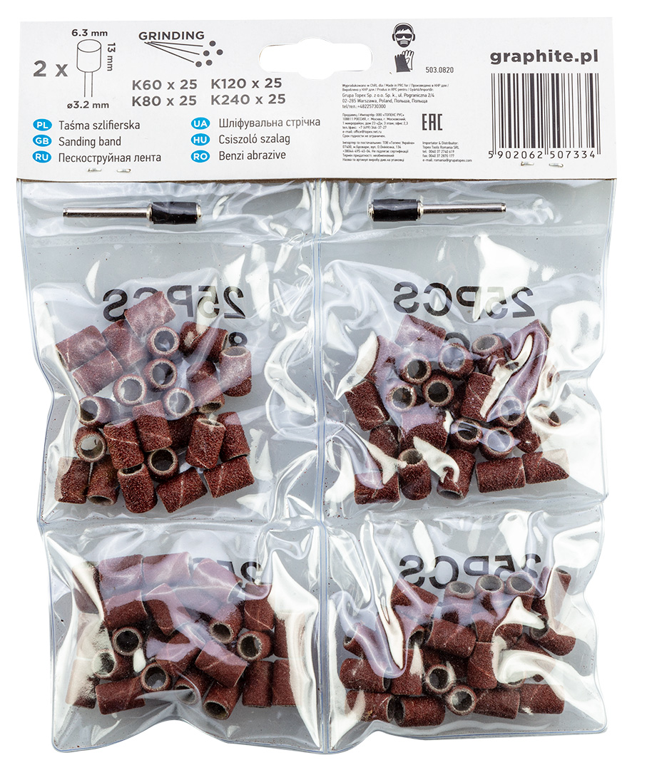 Csiszolószalagok GRAPHITE (ref. 55H076) átmérőjű 6.3 mm és fokozatok: K60, K80, K120 és K240. Mini darálóval való használatra szánják őket. Alkalmas fémek felületének csiszolására, alakítására és előkészítésére,kerámia, csempe, kő, üveg, műanyagok és üvegszál.