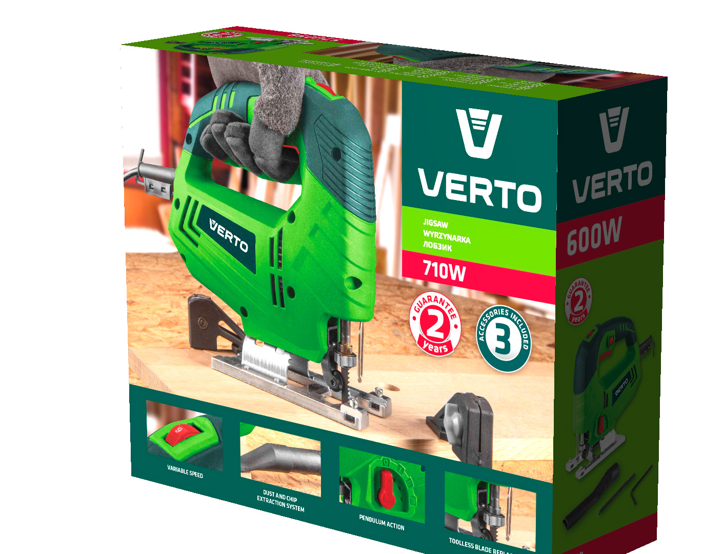 A VERTO 710 W teljesítményű szúrófűrész (ref. 52G058) egy masszív és praktikus eszköz a fa, fém és műanyag precíz és gyors vágásához. 8 és 65 mm közötti vágási mélységet tesz lehetővé. Pontos vágást biztosít 0° és 45° közötti lábszögben jobbra és balra. A beépített be- és kikapcsolóval ellátott ergonomikus fogantyú kényelmesebbé teszi a szerszám használatát. Beépített porelszívó rendszerrel rendelkezik. Tartozékokkal, mint például szerelőkulcs, párhuzamos vezető és fűrészlap. Az európai biztonsági szabványoknak való megfelelés biztosítja a CE-tanúsítványt. A VERTO márka elektromos szerszámok és tartozékok választékát kínálja minden barkácsoló számára.