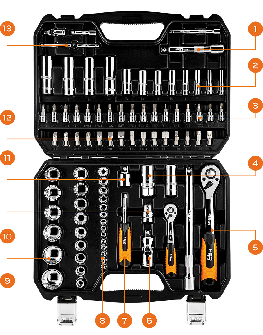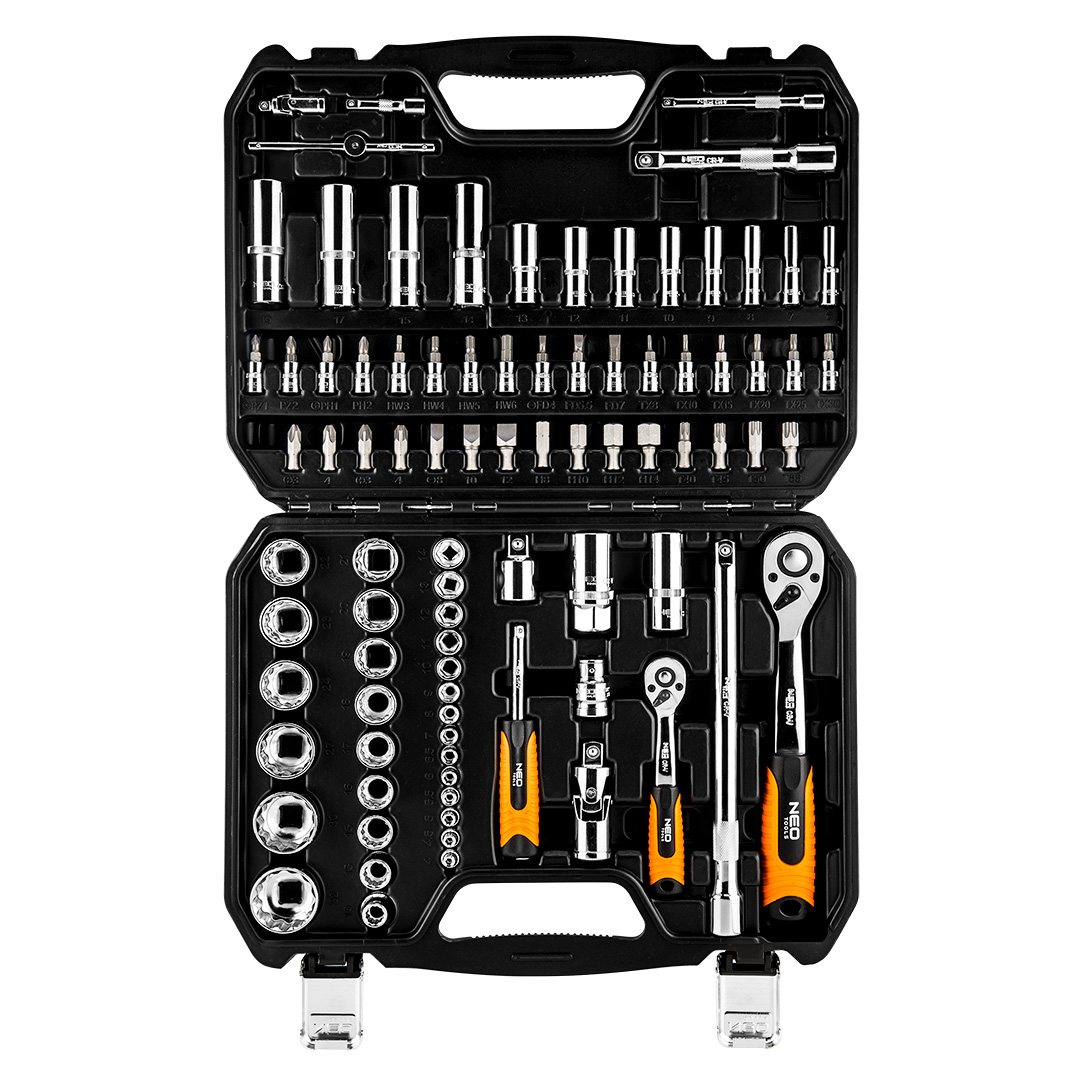 A NEO ¼” és ½”-os dugókulcs készlet 86 db kiváló minőségű króm-vanádium acélból készült elemből áll. A készlet részét képezi az ¼” és az ½”-os racsnis hajtókar is. A készletben dugókulcsok (4-32 mm közötti méretekben) és csavarhúzó bitek (lapos, kereszt, imbusz, Torx) gazdag sorozatai is megtalálhatók. Ezt egészíti ki a tartozékok széles köre. A szett praktikus hordtáskába van csomagolva. A termék megbízhatóságát bizonyítja a 25 éves jótállás. A NEO márka a professzionális igényeket is kielégíti.A NEO ¼”-os és ½”-os dugókulcs készlet (kat. sz. 08-664) 86 db kiváló minőségű króm-vanádium acélból készült elemből áll. A készletben megtalálható ¼”-os és ½”-os hajlított racsnis hajtókar is (hosszú élettartamú, 72 fogas kilincsművel). A készlet dugókulcsok (4-32 mm közötti méretekben) és csavarhúzó bitek (lapos, kereszt, imbusz, Torx) gazdag sorozatait is tartalmazza. Ezt egészíti ki a tartozékok széles köre. A készlet szolid, praktikus műanyag hordtáskába van csomagolva. A termék megbízhatóságát bizonyítja a 25 éves jótállás. A NEO márka a professzionális igényeket is kielégíti.