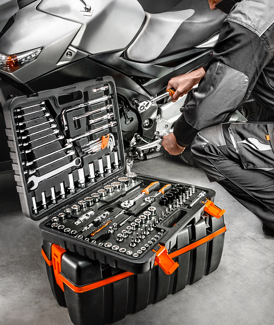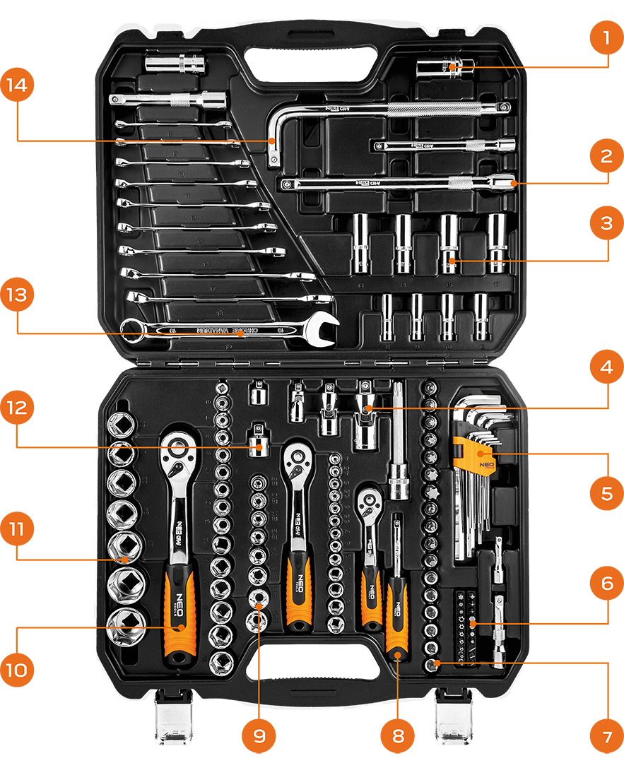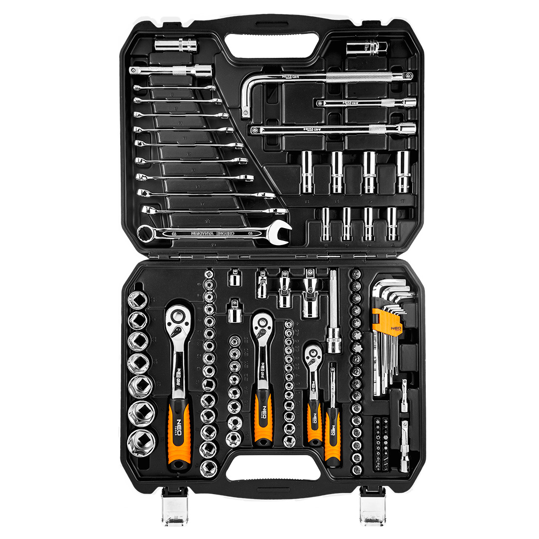 A NEO ¼” ½” és ⅜”-os dugókulcs készlet 126 db kiváló minőségű króm-vanádium acélból készült elemből áll. A készletben megtalálhatók racsnis hajtókarok, csillag-villáskulcsok és imbuszkulcsok is. A készlet dugókulcsok (4-32 mm közötti méretekben) és csavarhúzó bitek (lapos, kereszt, imbusz, Torx) gazdag sorozatait is tartalmazza. Ezt egészíti ki a tartozékok széles köre. A szett praktikus hordtáskába van csomagolva. A termék megbízhatóságát bizonyítja a 25 éves jótállás. A NEO márka a professzionális igényeket is kielégíti.A NEO 1/4″-os, 1/2″-os és 3/8″-os dugókulcs készlet (kat. sz. 08-667) 126 db kiváló minőségű króm-vanádium acélból készült elemből áll. A készlethez tartoznak ergonómikus markolatú hajlított racsnis hajtókarok (72-fogas kilincsművel), csillag-villáskulcsok és imbuszkulcsok praktikus tokban. A készlet dugókulcsok (4-32 mm közötti méretekben) és csavarhúzó bitek (lapos, kereszt, imbusz, Torx) gazdag sorozatait is tartalmazza. Ezt egészíti ki a tartozékok széles köre. A készlet praktikus, tartós műanyag hordtáskába van csomagolva. A termék megbízhatóságát bizonyítja a 25 éves jótállás. A NEO márka a professzionális igényeket is kielégíti.