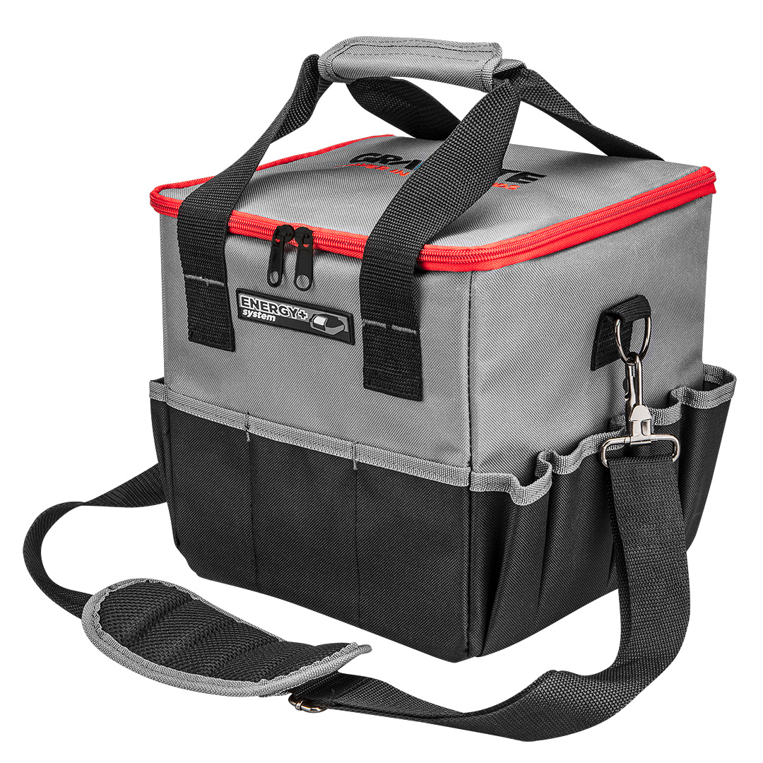 Tartós GRAPHITE Energy+ Elektromos szerszám táska, űrtartalma 12 l. Nagy szövetsűrűségű, a kopásnak jól ellenálló anyagból készül. A belső oldalon laminált poliészter anyag óvja a táska tartalmát a nedvességtől és a kedvezőtlen időjárási körülményektől. 14 külső zseb, 3 nagyméretű belső zseb és 9 szerszámtartó akasztó. Az akasztók lehetővé teszik a fúró-csavarozó szerszámok (fém akasztó), vagy mérőszalag (textil akasztó) rögzítését. A táska méretei lehetővé teszik két elektromos szerszám és tartozékainak (akkumulátor, akkutöltő, külön kiszerelés) komfortos hordozását. Az akkumulátorok, valamint egyéb alkatrészek további tépőzáras hevederekkel rögzíthetők, hogy ne mozduljanak el. A táska kényelmes és szolid hordfüllel, valamint külön szabályozható, fém akasztókkal ellátott válpánttal is rendelkezik. A táska alja merevített, vízálló, talpakkal, mely a nehéz munkakörülmények között is védi a táska tartalmát. A táska hátfalán kisablak található a perszonalizált cimke, vagy névjegykártya számára.