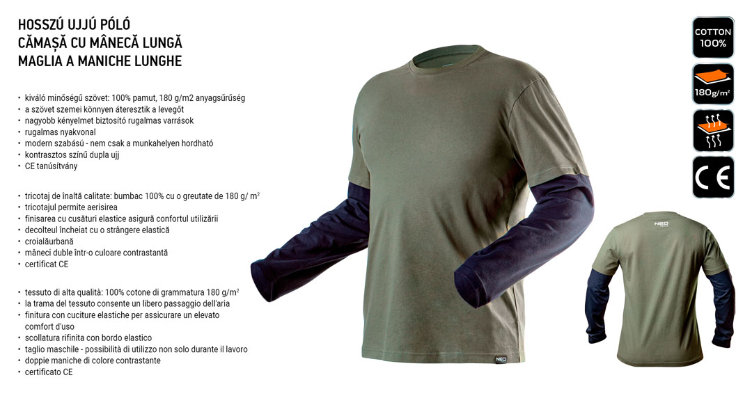NEO munkapóló, CAMO termékcsalád, olívazöld színű, kiváló minőségű pamut szövetből készül. A terméket kiemelik a kontrasztos színű dupla ujjak. Városias szabása és divatos színe lehető teszi a termék munka utáni viselését. A CE európai tanúsítványa garantálja minőségét. A NEO márka a professzionális igényeket is kielégíti.