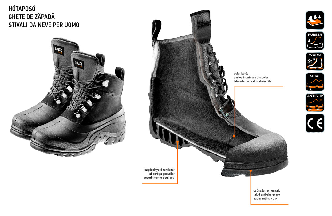 NEO Férfi téli bakancs (82-136), mérete 45, alap felszerelés a téli szabadban végzett munkáknál. Az ökobőr és a kimagasló minőségű TPR gumi öntött talp garantálják a hő és a víz elleni védelmet. A meleg bélés biztosítja a felhasználó termikus komfortját, míg a csúszásgátló talp növeli a csúszós talajon való közlekedés során a biztonságot. A NEO márka a professzionális igényeket is kielégíti.