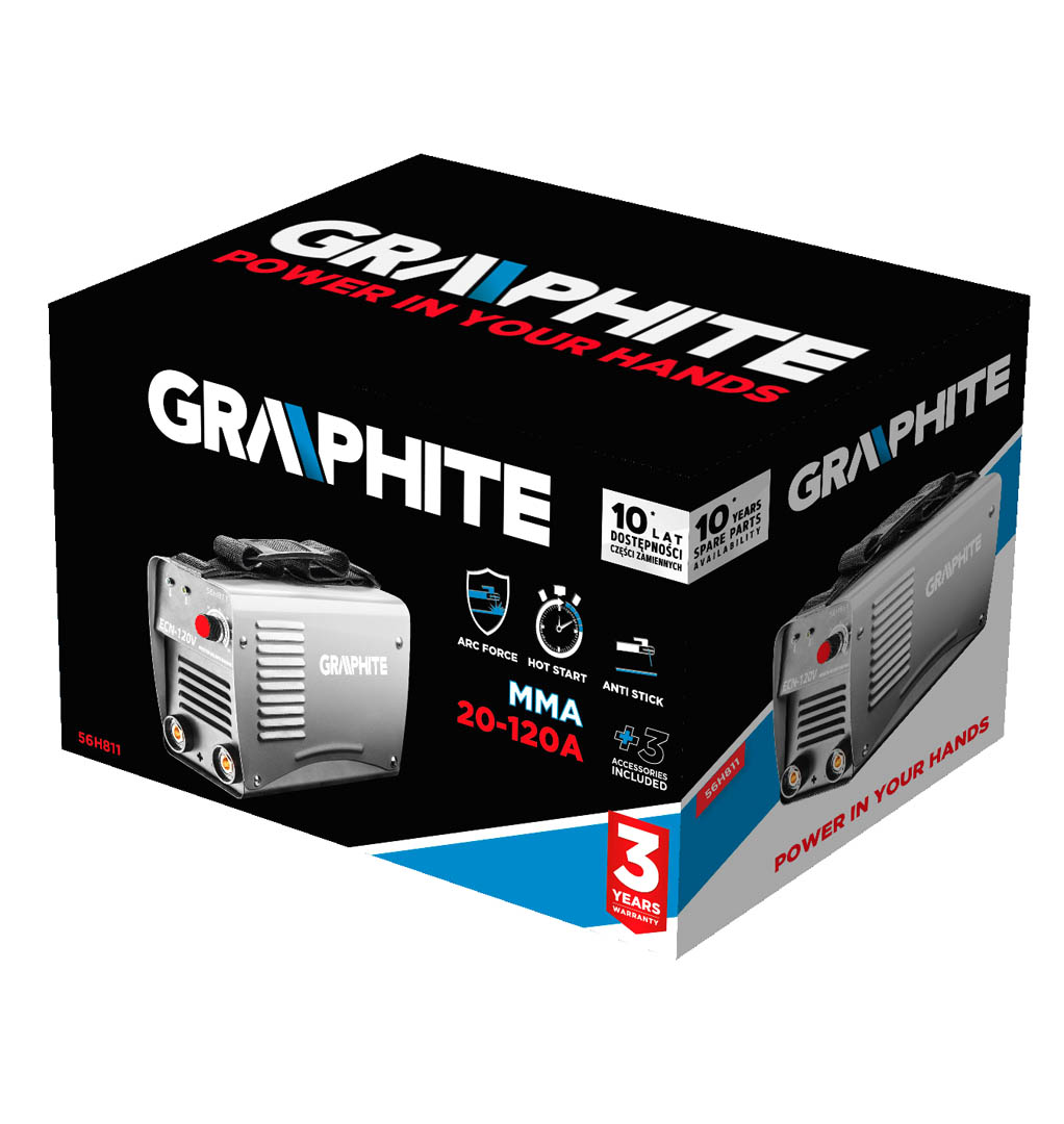 A GRAPHITE inverteres hegesztőgép (ref.sz. 56H811) ideális amatőr és félprofesszionális hegesztési munkákhoz. A 230V tápfeszültség révén hagyományos hálózati aljzatról működtethető. Az alkalmazott nagy teljesítményű bipoláris tranzisztorok révén a berendezés hatékonyan üzemel és precízen vezérli a hegesztő áramot. A „Hot Start” funkció megkönnyíti az ív begyújtását és a hegesztés elkezdését. A berendezés kis súlya (4.8 kg) és a vállszíj megkönnyíti a berendezés hordozását. A teljes készlethez tartozó kábelek, arcvédő és kalapács lehetővé teszik a berendezés vásárlás utáni azonnali használatát. A ventilátoros hűtés és a túláramvédelem garantálja a hegesztőgép hosszú és zavarmentes működését.