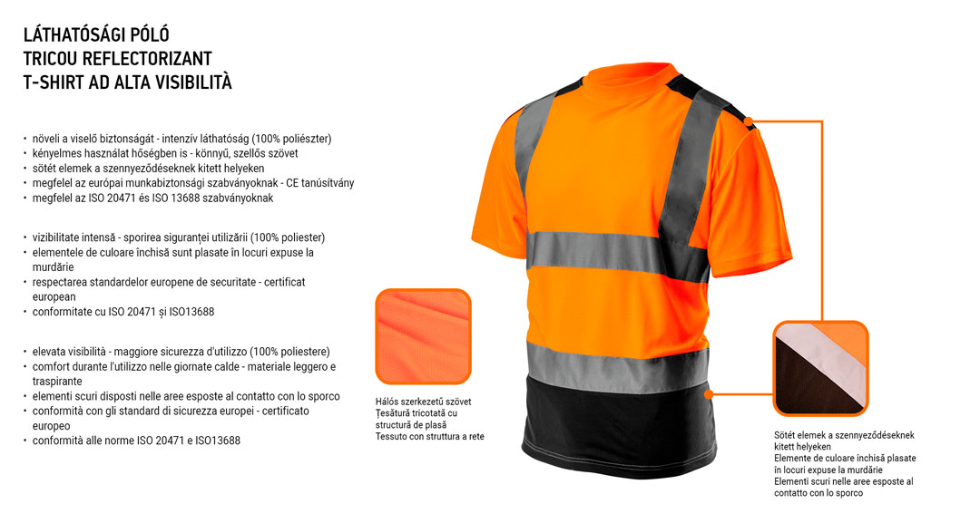 NEO Láthatósági póló (ref.sz. 81-731-S), kimagasló láthatóságú, a viselője biztonságát növelő praktikus megoldás, jelezve annak jelenlétét mind a nappali világítási körülmények között, mind a sötétben, mesterséges világításnál, pl. a gépkocsik lámpáinak fényében. A könnyű és szellős anyag alkalmazása növeli a felhasználó komfortját a hőség idején. Sötét anyagok kerültek alkalmazása a szennyeződéseknek leginkább kitett helyeken. A termék EN ISO 13688:2013 szabvány szerinti kivitelezése és az európai tanúsítványa minőségének garanciája. Az európai biztonsági standardoknak való megfelelőséget a CE tanúsítvány biztosítja. A NEO márka a professzionális igényeket is kielégíti.