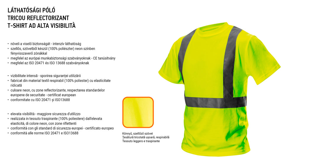 NEO Láthatósági póló (ref.sz. 81-732-M), kimagasló láthatóságú, a viselője biztonságát növelő praktikus megoldás, jelezve annak jelenlétét mind a nappali világítási körülmények között, mind a sötétben, mesterséges világításnál, pl. a gépkocsik lámpáinak fényében. A könnyű és szellős anyag alkalmazása növeli a felhasználó komfortját a hőség idején. A termék EN ISO 13688:2013 szabvány szerinti kivitelezése és az európai tanúsítványa minőségének garanciája. Az európai biztonsági standardoknak való megfelelőséget a CE tanúsítvány biztosítja. A NEO márka a professzionális igényeket is kielégíti.