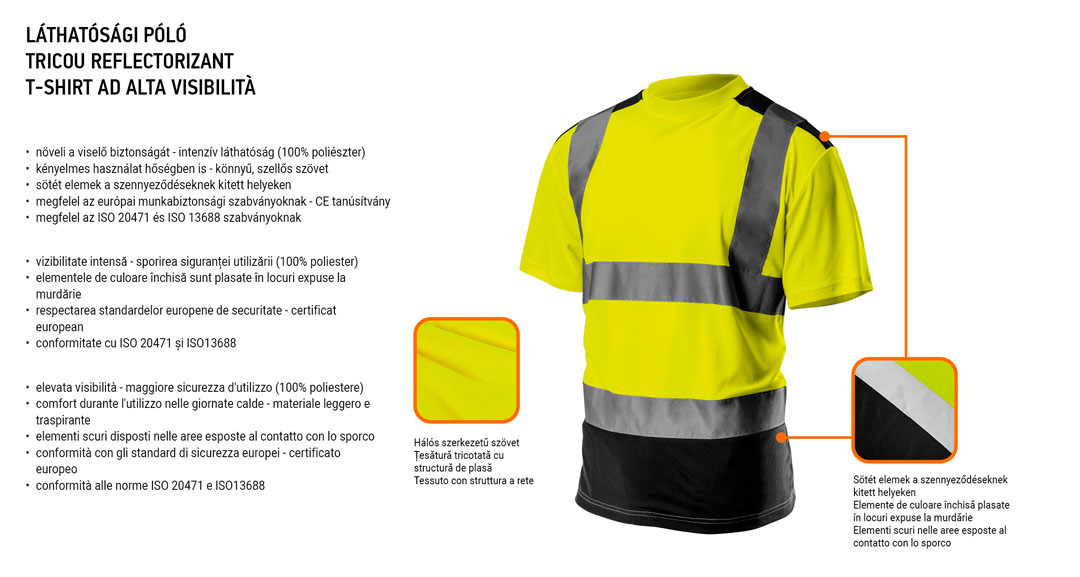 NEO Láthatósági póló (ref.sz. 81-730-S), kimagasló láthatóságú, a viselője biztonságát növelő praktikus megoldás, jelezve annak jelenlétét mind a nappali világítási körülmények között, mind a sötétben, mesterséges világításnál, pl. a gépkocsik lámpáinak fényében. A könnyű és szellős anyag alkalmazása növeli a felhasználó komfortját a hőség idején. Sötét anyagok kerültek alkalmazása a szennyeződéseknek leginkább kitett helyeken. A termék EN ISO 13688:2013 szabvány szerinti kivitelezése és az európai tanúsítványa minőségének garanciája. Az európai biztonsági standardoknak való megfelelőséget a CE tanúsítvány biztosítja. A NEO márka a professzionális igényeket is kielégíti.