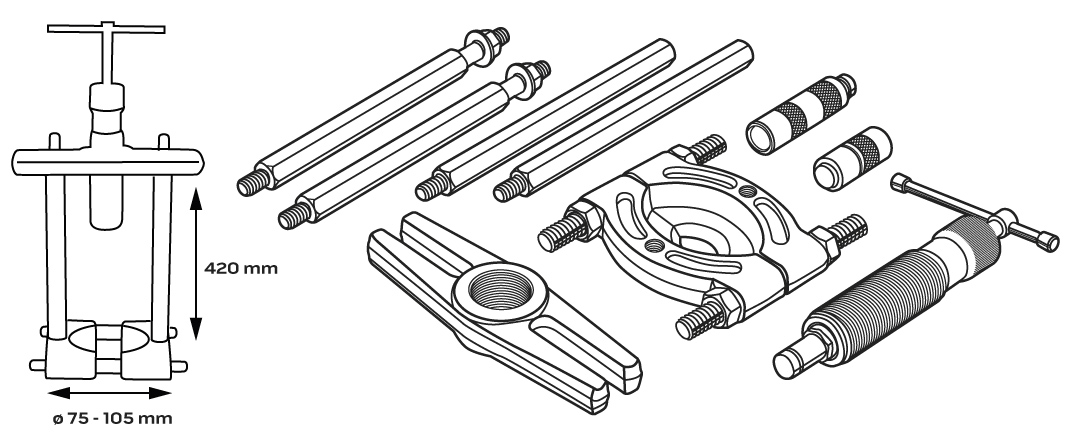 NEO működtetővel ellátott, akár 10 tonnás nyomású húzógép, amely többek között egy szeparátorból és egy hidraulikus működtetővel ellátott húzógépből álló elemkészlet. A lehúzót professzionális szervizek és autószervizek számára tervezték. A következők eltávolítására szolgál: csapágyak, fogaskerekek, hüvelyek, hüvelyek. Különösen hasznos a szétszerelt elemek erős illesztéséhez, ahol nagy erőt kell kifejteni a pontosság fenntartása mellett. Maximális préselési mélység 420 mm. Készlet tokba csomagolva.