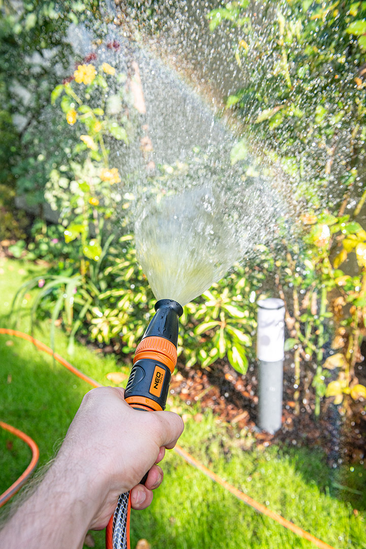 A NEO egyenes locsoló (ref. 15-700) többek között pázsit öntözésére szolgál. Az állítható fej lehetővé teszi a vízsugár alakjának beállítását a ködtől az erős pontsugárig.