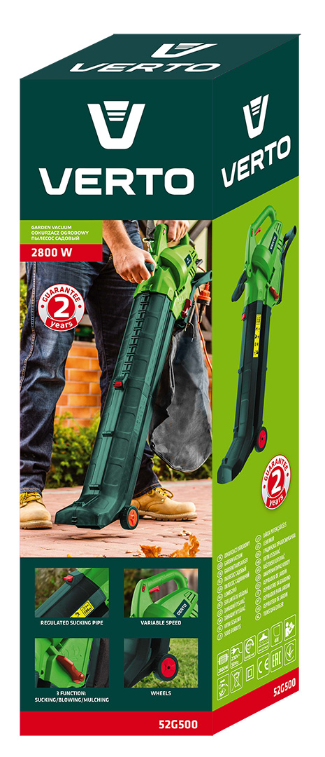 A VERTO 2800 W kerti porszívó kiseprő, elszívó és levél aprító funkciókkal rendelkezik. Száraz kerti hulladékok, például levelek eltávolítását szolgálja. A hulladék felaprító funkcióval az eltávolított hulladék térfogata akár a tizedére csökkenhet, valamint meghosszabbodik a zsák cseréjéig lehetséges munkaidő. A 2800 W teljesítményű motor biztosítja a hulladékok gyors és könnyű eltávolítását. A porszívó ezen túlmenően az üzemmód (kiseprés/elszívás) gyors átkapcsolását segítő, kényelmes kapcsolóval rendelkezik. A 40 l űrtartalmú tartós textil zsák a gyors kiürítést lehetővé tévő cipzárral rendelkezik. Az európai biztonsági standardoknak való megfelelőséget a CE tanúsítvány biztosítja. A VERTO márka elektromos szerszámokat és tartozékokat kínál minden ezermester számára.