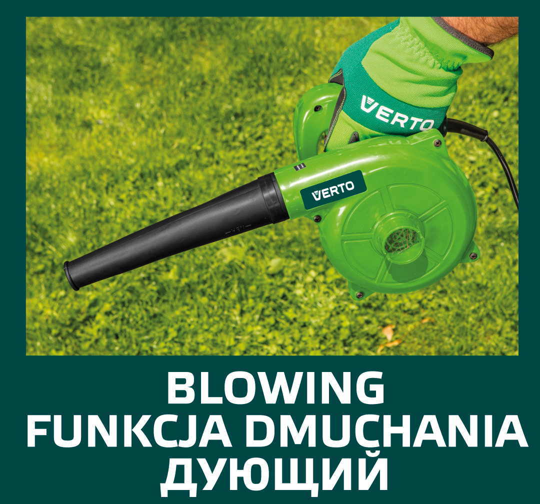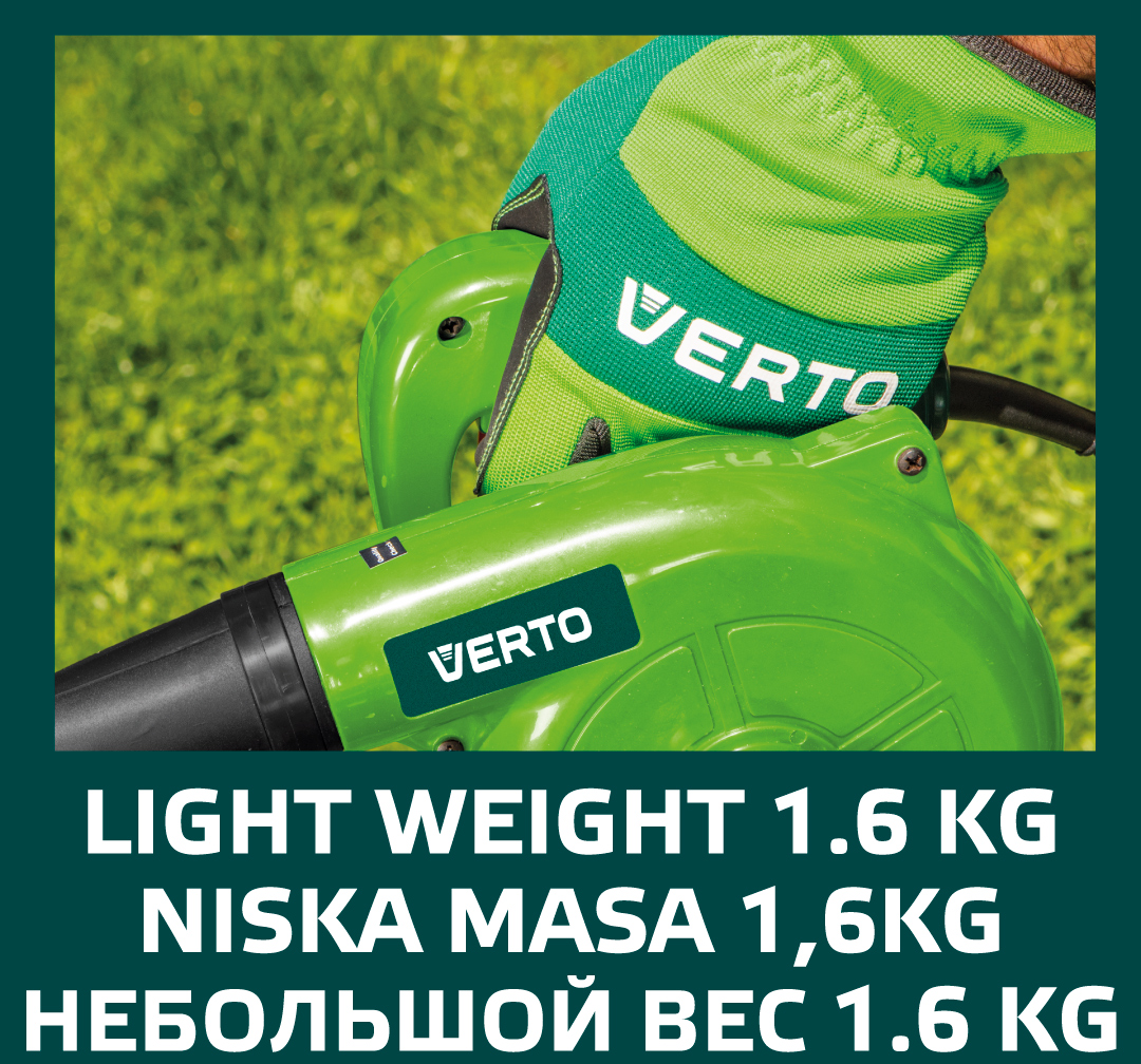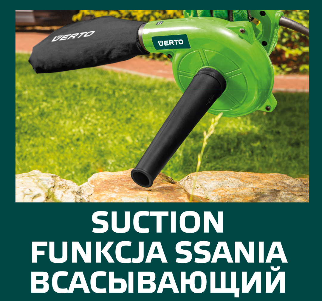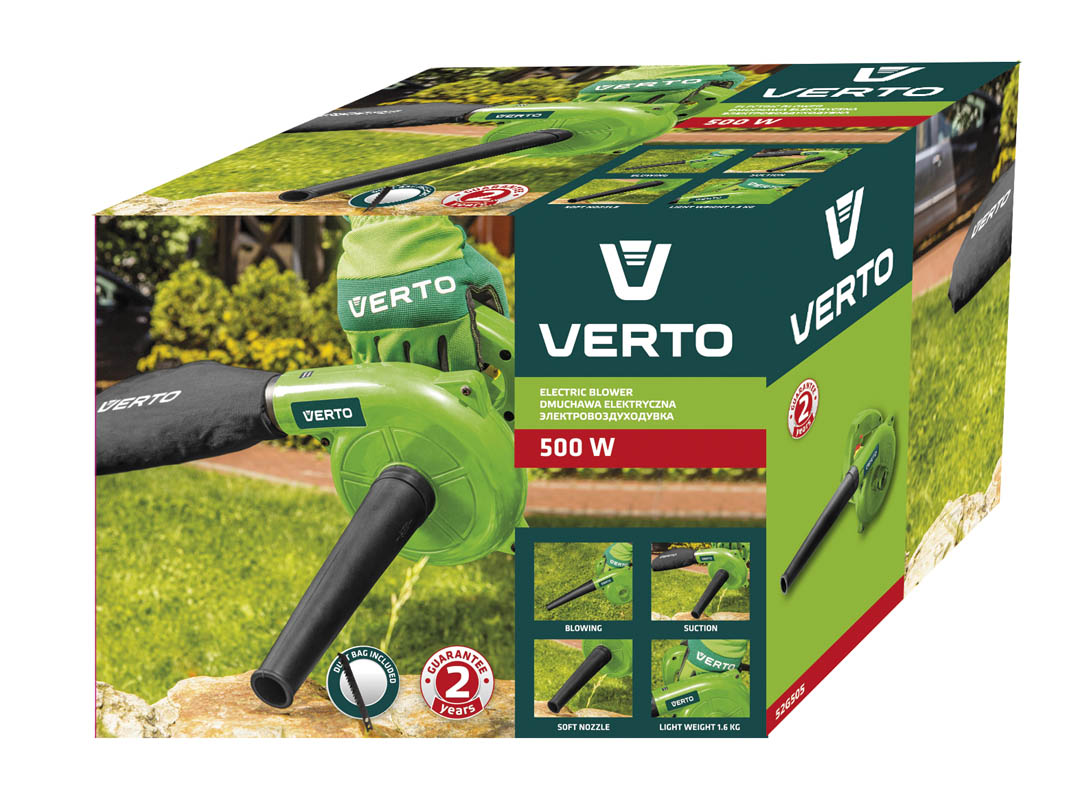 Az 500 W teljesítményű VERTO elektromos szívó-fúvó praktikus és funkcionális eszköz fúvó és szívó üzemmódban. Alkalmazásra talál úgy a ház körül, a kertben, mint a műhelyben, vagy a garázsban is. Alkalmas antisztatikus tisztításra, gépek, berendezések porszívózására és szárítására szolgál, valamint lomb, fű, tűlevelek lefúvására teraszokról, ösvényekről, járdákról. Ergonómikus, kényelmes egy kézi használatot biztosító markolattal van ellátva. A készülékhez tartozékként gyűjtőzsák is tartozik. A CE tanúsítvány igazolja az európai biztonsági normáknak való megfelelést. A VERTO márka ajánlata elektromos berendezéseket és tartozékokat tartalmaz az ezermesterek számára.