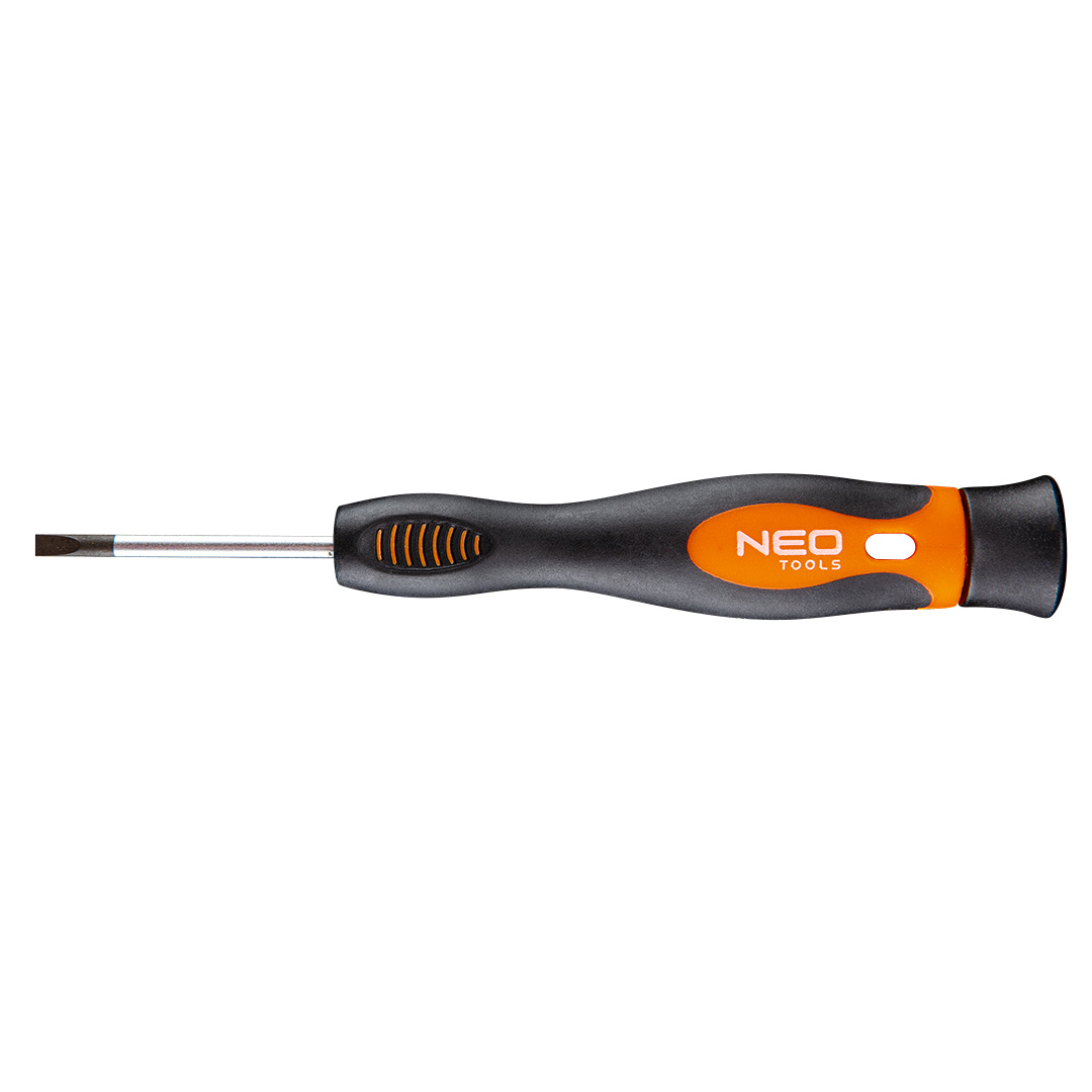 NEO lapos műszerész csavarhúzó. A csavarhúzó szára kivételesen ellenálló S2 acélból készül. A csavarhúzó hegy hőkezelésnek lett alávetve, így megfelelő keménységet és hajlítószilárdságot ért el. A csavarhúzó hegye mágneses. A markolat forgó kupakja megkönnyíti a csavarok precíz meghúzását. A bimateriál markolat ellenálló vegyszerek, kenőolajok és zsírok hatásának. A szerszám minőségét bizonyítja a TÜV tanúsítvány és a gyártó által nyújtott 25 éves jótállás. A NEO márka a professzionális igényeket is kielégíti.