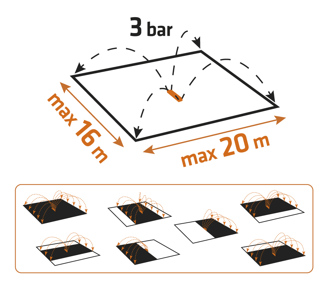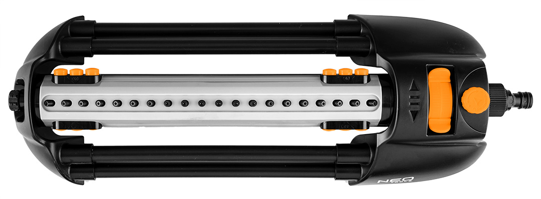 A NEO oszcilláló locsolót (ref. 15-772) pázsit, kertek és növények öntözésére tervezték. A vízfelület maximális mérete 16 x 20 m. 20 kimeneti fúvókával van felszerelve. Ezek közül 6 rendelkezik ON/OFF funkcióval, amelynek köszönhetően beállíthatja a permetezés szélességét. Az esőztető a mozgási tartomány beállítására szolgáló csúszkákkal, valamint a permet erősségének beállítására szolgáló gombbal rendelkezik, amely megváltoztatja a permetezési tartományt. A készlet tartalmaz egy tűt a fúvóka tisztításához.