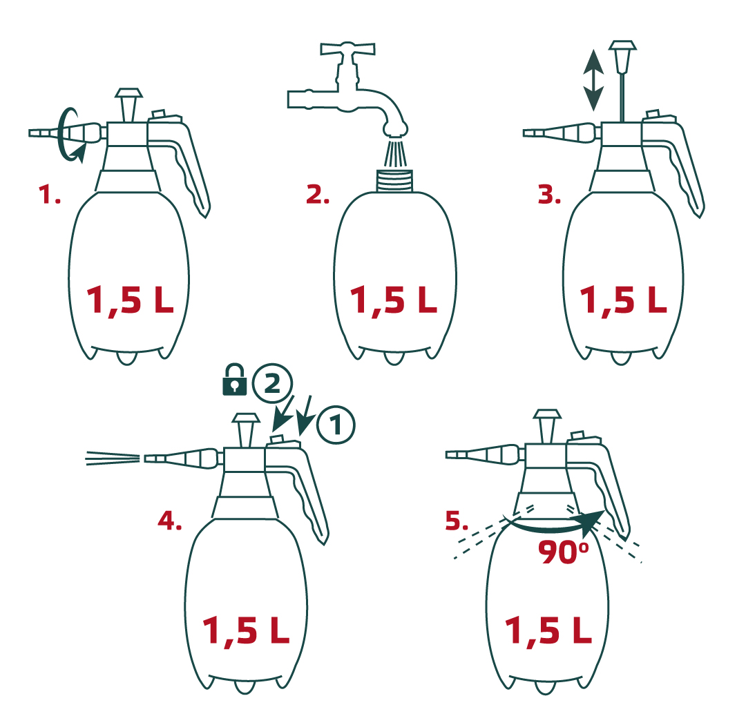 VERTO nyomásos permetező (ref.sz. 15G502) űrtartalma 1.5 liter. Üzemi nyomása 2.5 – 2.5 bar A rögzíthető áramlás növeli a munkavégzés komfortját. A permetező alkalmazható 0 és + 45°C közötti hőmérsékleten.
