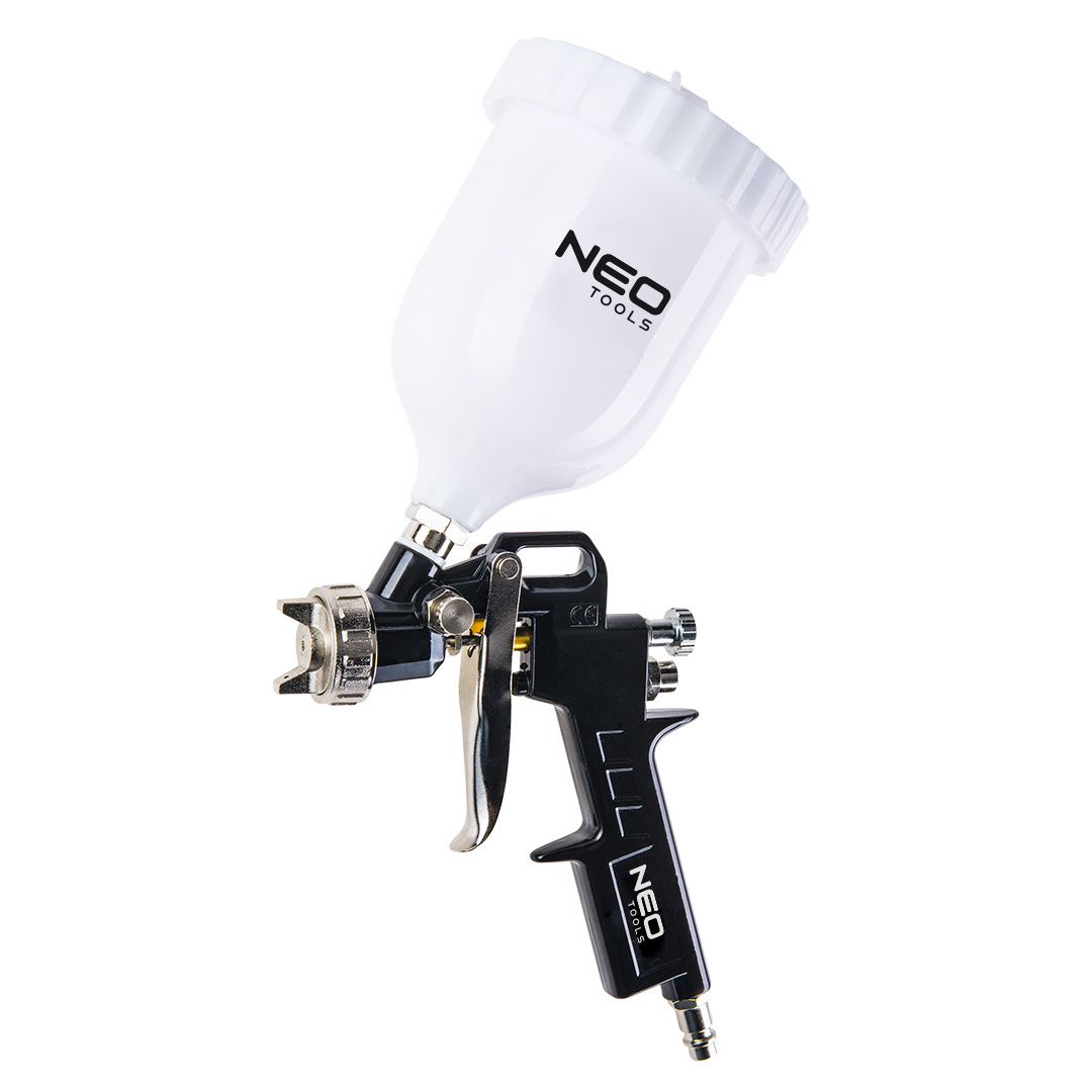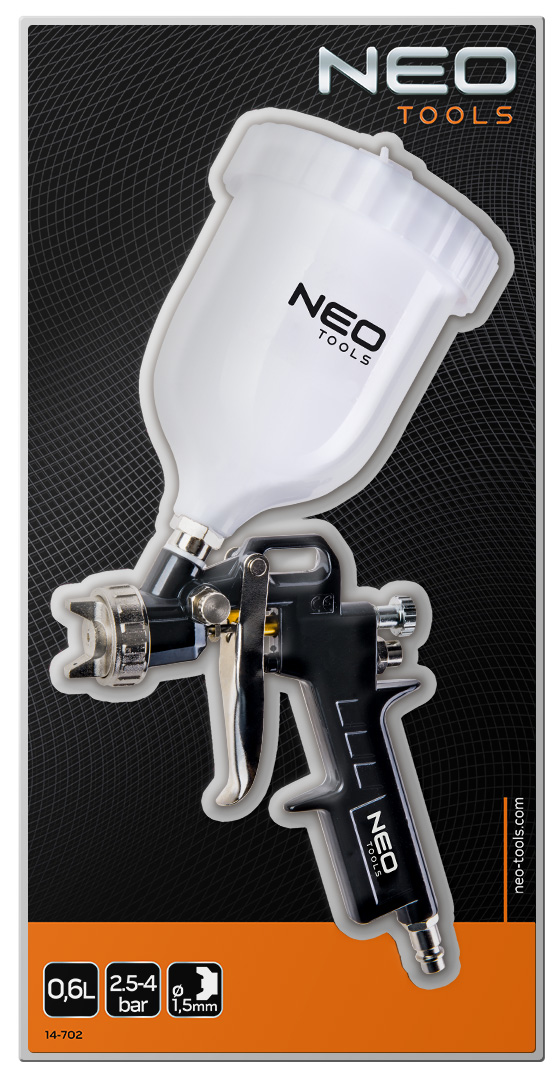 NEO felső tartályos festékszóró pisztoly 0,6 literes műanyag . Rozsdamentes acélból készült 1,5 mm átmérőjű fúvókával. Hatékony, pontos munka végezhető vele. Üzemi nyomása 4 bar. A CE tanúsítvány igazolja az európai biztonsági normáknak való megfelelést.