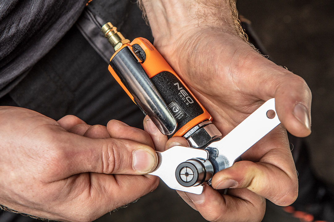 NEO pneumatikus derékszög csiszoló (ref. száma 14-016) 6 mm/3mm csapátmérőjű tartozékokhoz. Maximális fordulatszáma 20 000 ford./perc. Nem átfagyó markolattal, ami jelentősen megnöveli használati komfortját. A CE tanúsítvány igazolja az európai biztonsági normáknak való megfelelést. A NEO márka a professzionális igényeket is kielégíti.