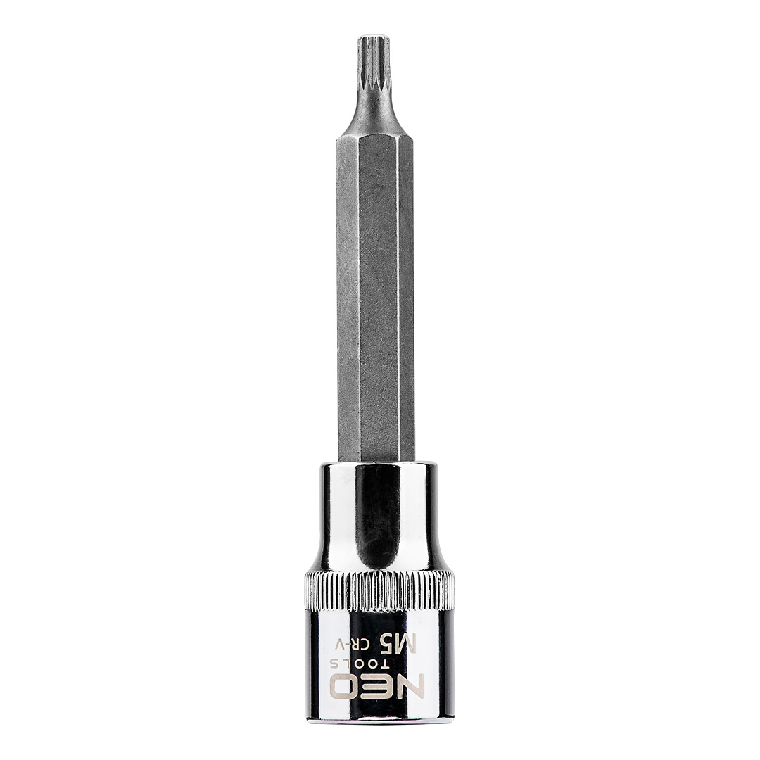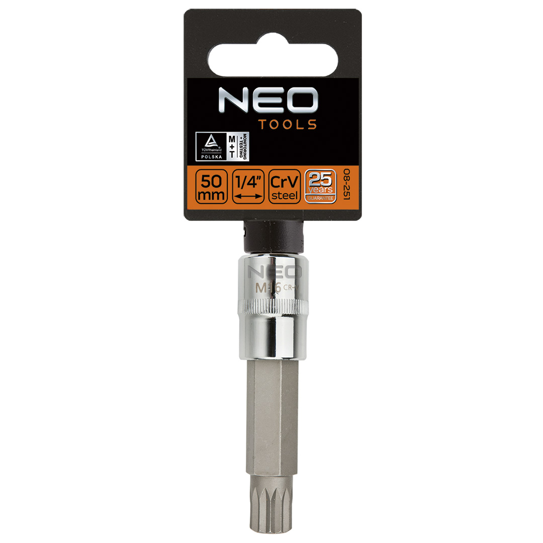 A NEO ½”-os Spline dugókulcs króm-vanádium acélból készül, 100mm HOSSZÚ, DIN 3124 . A dugókulcs szferikus kialakítása igen széles alkalmazási lehetőségeket biztosít, lehetővé téve a Torx, a Spline, a 12-lapú, a metrikus, a colos és a négylapú csavarok kicsavarását is. A szerszám minőségét bizonyítja a TÜV tanúsítvány és a 25 éves gyártói garancia. A NEO márka a professzionális igényeket is kielégíti.
