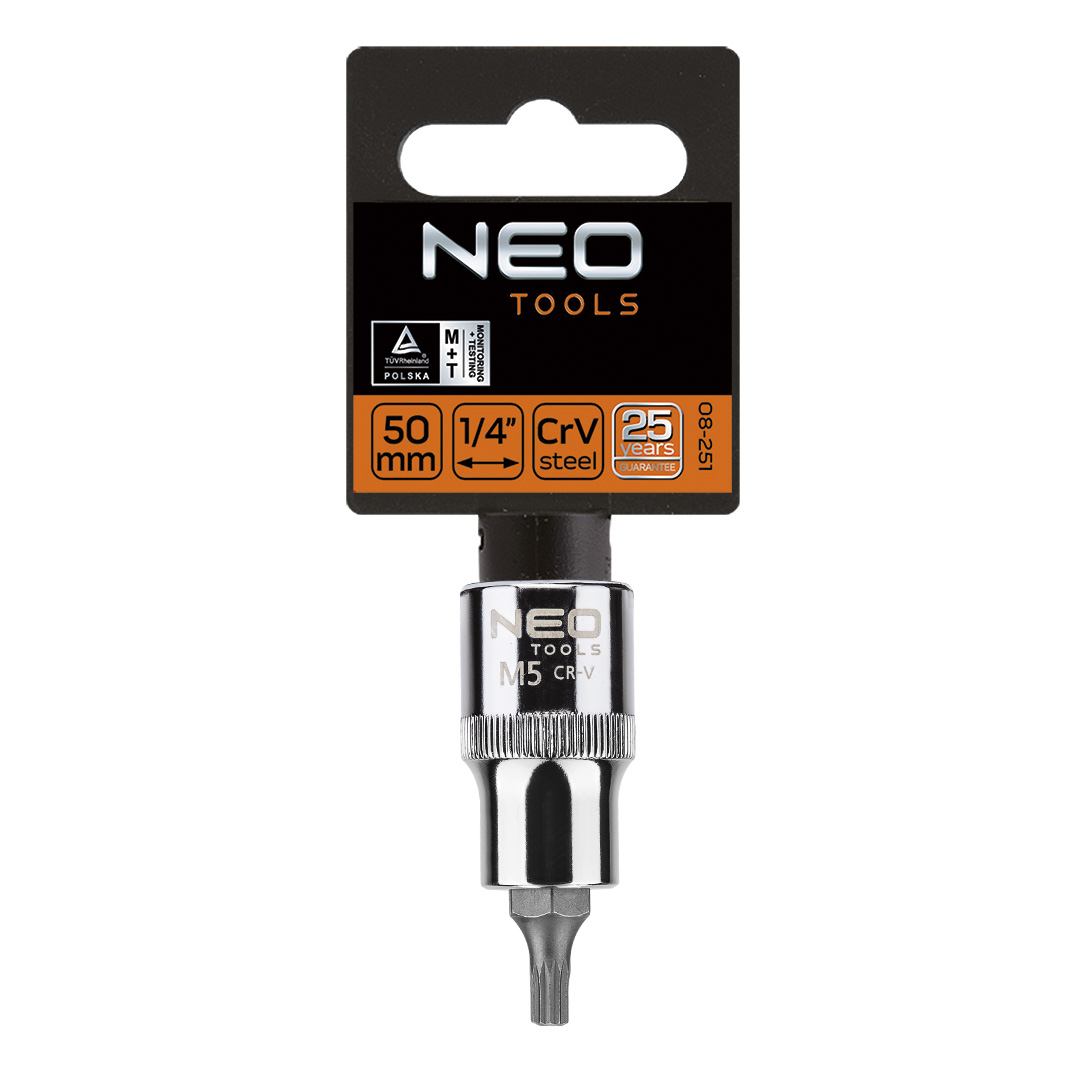 A NEO ½”-os Spline dugókulcs króm-vanádium acélból készül, 55mm HOSSZÚ, DIN 3124 . A dugókulcs szferikus kialakítása igen széles alkalmazási lehetőségeket biztosít, lehetővé téve a Torx, a Spline, a 12-lapú, a metrikus, a colos és a négylapú csavarok kicsavarását is. A szerszám minőségét bizonyítja a TÜV tanúsítvány és a 25 éves gyártói garancia. A NEO márka a professzionális igényeket is kielégíti.