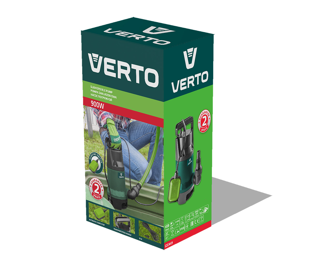 A VERTO 900 W teljesítményű búvárszivattyú (kat. sz. 52G449) tiszta és szennyezett víz szivattyúzására alkalmas, a szennyeződések mérete nem lehet nagyobb 35 mm-nél. A szivattyú vízszállítási teljesítménye 7 500 liter/óra. A berendezés az I. érintésvédelmi osztályba sorolt, védettségi foka IPX8. A max. üzemi merülési mélység 7 m, a vízszállítási magasság pedig max. 8,5 m. Rendelkezik automatikus, vízszintfüggő be- és kikapcsolási funkcióval. Hosszú vörösréz hálózati csatlakozókábellel és hordfogantyúval van felszerelve. A szivattyú nem használható élelmiszer célú víz szállítására. A szivattyúhoz csatlakozócsonk és vakdugó tartozik. A CE tanúsítvány igazolja az európai biztonsági normáknak való megfelelést. A VERTO márka ajánlata elektromos kéziszerszámokat és tartozékokat tartalmaz az ezermesterek számára.