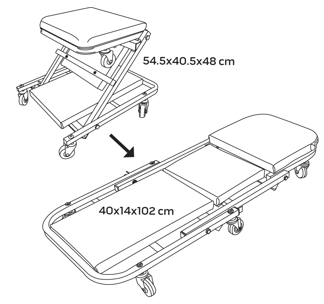 A NEO 2 az 1-ben műhelykanapé professzionális garázsok és autószervizek, valamint haladó amatőrök számára készült. A műhelyszék funkcióval rendelkező kanapé két pozícióban teszi lehetővé a munkát: ülve és fekve. A váz fémből, az ülés pedig barátságos és tartós műanyagból készült. 6 lengőkerékkel van felszerelve, ami megkönnyíti a manőverezést. Egyetlen mozdulattal praktikus és kényelmes műhelyüléssé alakítható. A maximális terhelés fekvő helyzetben 150 kg, míg műhelyszéki zsámoly formájában 120 kg.