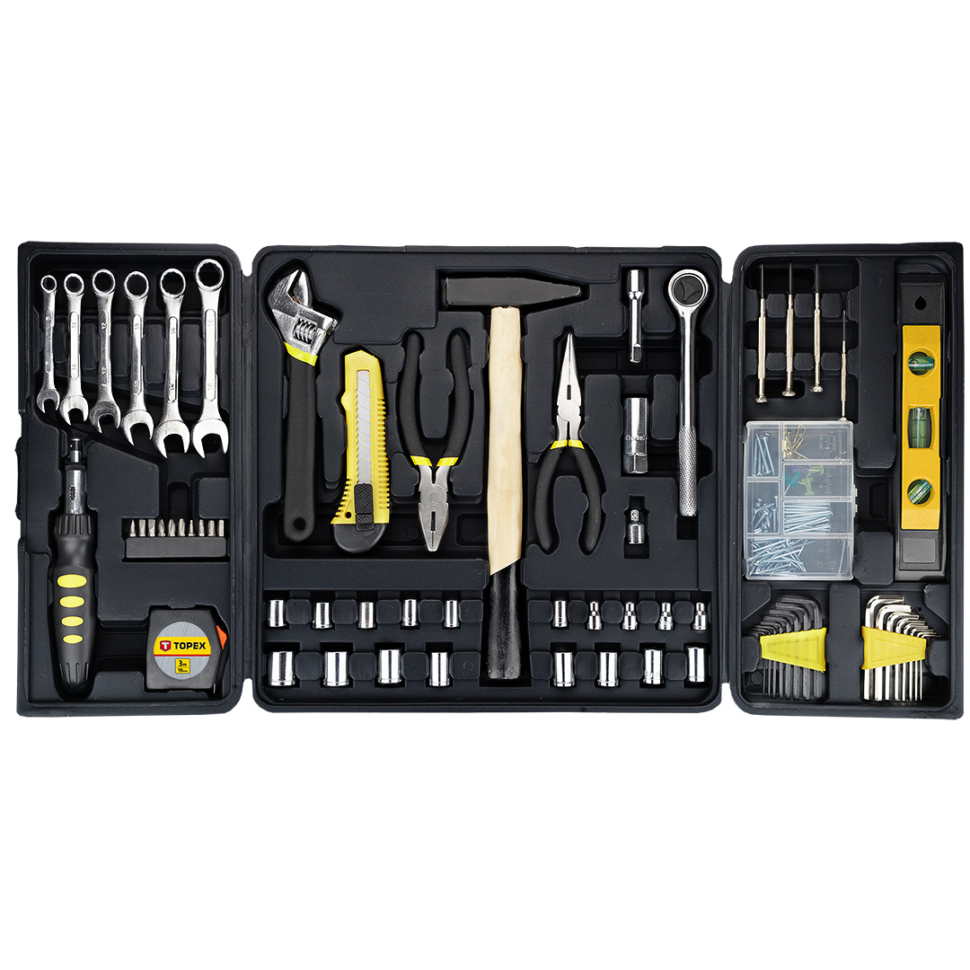 A TOPEX szerszámkészlet 135 db elrendezett elemet tartalmaz kényelmes műanyag hordtáskában. Minden elemére jellemző a kiváló minőségű kivitel. A készletben olyan alapvető szerszámok kaptak helyet, mint pl. a 300 g-os kalapács, a törhető pengéjű kés, az acél mérőszalag, a vízszintező, az állítható kulcs, a csillag-villás kulcsok, a dugókulcsok, vagy a csavarhúzó bitek. Praktikus megoldás a hordtáskába szerelt rendeződoboz szegekhez, csavarokhoz, és egyéb apróságokhoz. A készlet széleskörű felhasználásra találhat mindenféle apróbb szerelési, gép- és autójavítási és egyéb munkában minden ezermester otthonában vagy garázsában. A TOPEX márka ezermestereknek készül.