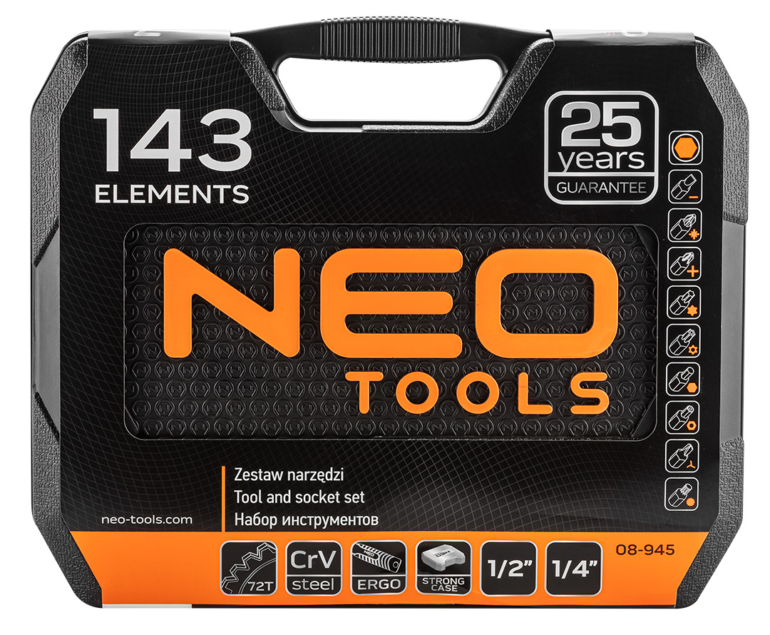 A NEO szerszámkészlet (ref. 08-945) nagyon jó megoldás mechanikai, elektromos, vízvezeték-szerelési, háztartási munkákhoz. A 143 tétel éppen megfelel az otthoni műhely igényeinek. A 2 méretű racsni és a tartozékok széles körű felhasználási lehetőséget biztosítanak: az 1/2″ méret lehetővé teszi a nagy erők alkalmazását, az 1/4″ méret pedig lehetővé teszi, hogy ott is használhassa, ahol semmi más nem fér el. Minden mérethez 72 fogú precíziós racsni (5o osztás), egy készlet hatszögletű foglalat, hosszabbítók és csuklók – az alapok. Fordítson különös figyelmet a készlet tartalmára: gyújtógyertya dugókulcsok – a szerelőnek, csavarhúzók, fogók – a villanyszerelőnek, barkácsolónak, kalapács, csőkulcs, állítható csőkulcs – szerszámok minden alkalomra, az 1/4″ csavarhúzó nyele közönségesnek tűnik, de a nyélben egy extra 1/4″ foglalat található, amely lehetővé teszi, hogy hosszabbítóként használhassa egy extra nyéllel a pontos vezetéshez. Ha ehhez hozzáad egy adapteres bitkészletet és egy sor 1/4″-os aljzatot is adunk – gyakorlatilag bármit össze lehet csavarozni. Tökéletes kiegészítői a gyűrűs csavarkulcsok, amelyek a csavarok lazításán és meghúzásán kívül tökéletesen működnek támasztékként is, amikor a racsnival dolgozva egy csavart vagy anyát tartanak a csatlakozás másik oldalán. Az elemek száma több ezer kombinációt tesz lehetővé, és gyakorlatilag csak a képzelet szab határt a lehetőségeknek. Minden dugókulcs, racsni és csavarkulcs nagy szilárdságú króm-vanádium acélból (Cr-V), a csavarhúzóhegyek S2 szerszámacélból készülnek. Az egész egy méretre szabott, masszív tokban, fémkapcsokkal.