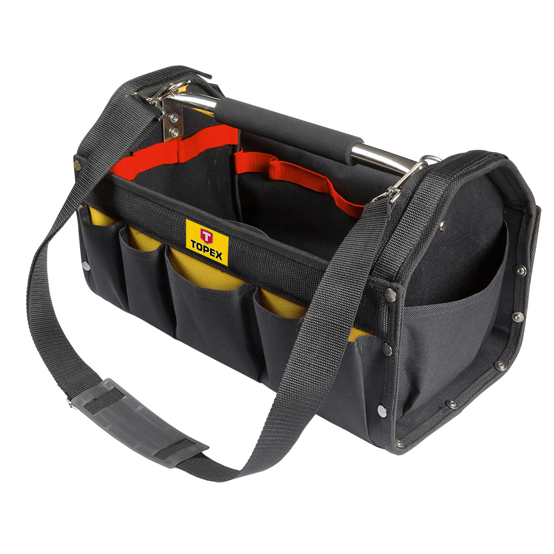 TOPEX 19″-os szerelőtáska sérüléseknek ellenálló műanyagból, mérete 42 x 22 x 24 cm. A sok zseb – kívül és belül – megkönnyíti a szerszámok elrendezett tárolását. Erős bimateriál hordfogantyúval és vállszíjjal. A merevített fenéklap lehetővé teszi nehéz tárgyak szállítását is. A TOPEX márka ezermestereknek készül.