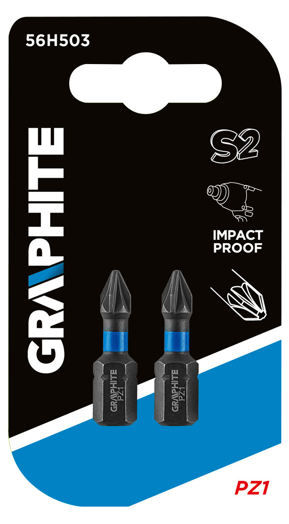 GRAPHITE torziós bit ütvecsavarozáshoz (ref. 56H503) PZ1x25 mm. Nagy teljesítményû bitek, amelyeket nagy nyomatékú csavarbehajtóval vagy ütvecsavarozóval, történő munkavégzéshez terveztek. Kiváló minőségű S2 acélból készül, amelyet fokozott rugalmasság és a mechanikai sérülésekkel szembeni ellenállás jellemzi. A nagy nyomaték hatására forgó torziós zóna csökkenti az erőátadást, ami ellenállóbbá teszi a töréssel szemben, és élettartama lényegesen hosszabb lesz. A hegy csúcspontja tökéletes illeszkedést garantál. A GRAPHITE márka a professzionális igényeket kielégítő elektromos szerszámok és tartozékok széles választékát kínálja.