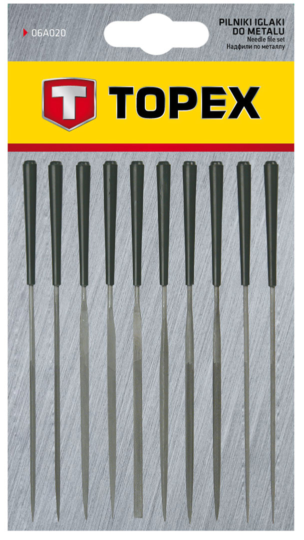 TOPEX tűreszelő készlet, hosszúságuk 140 mm, átmérőjük 3 mm. Fémek precíziós reszelésére szolgál elsősorban. A tíz univerzális alak lehetővé teszi legkülönfélébb alkalmazásukat. A TOPEX márka ezermestereknek készül.