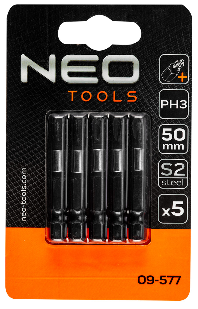 NEO ütvecsavarozó bitek (ref. 09-577) egy 5 db 50 mm hosszú, PH3 típusú, professzionális ütvecsavarozó bitből álló készlet. Ezeket 1/4″-os csavarhúzókhoz tervezték. Olyan rendszerrel rendelkeznek, amely megakadályozza, hogy a penge lecsússzon a csavarról. A bitek S2 acélból készülnek. Magas, 21,8 Nm-es meghúzási nyomaték érhető el. A nyomatékelnyelő rendszer megvédi a biteket a gyors kopástól és jelentősen meghosszabbítja élettartamukat.