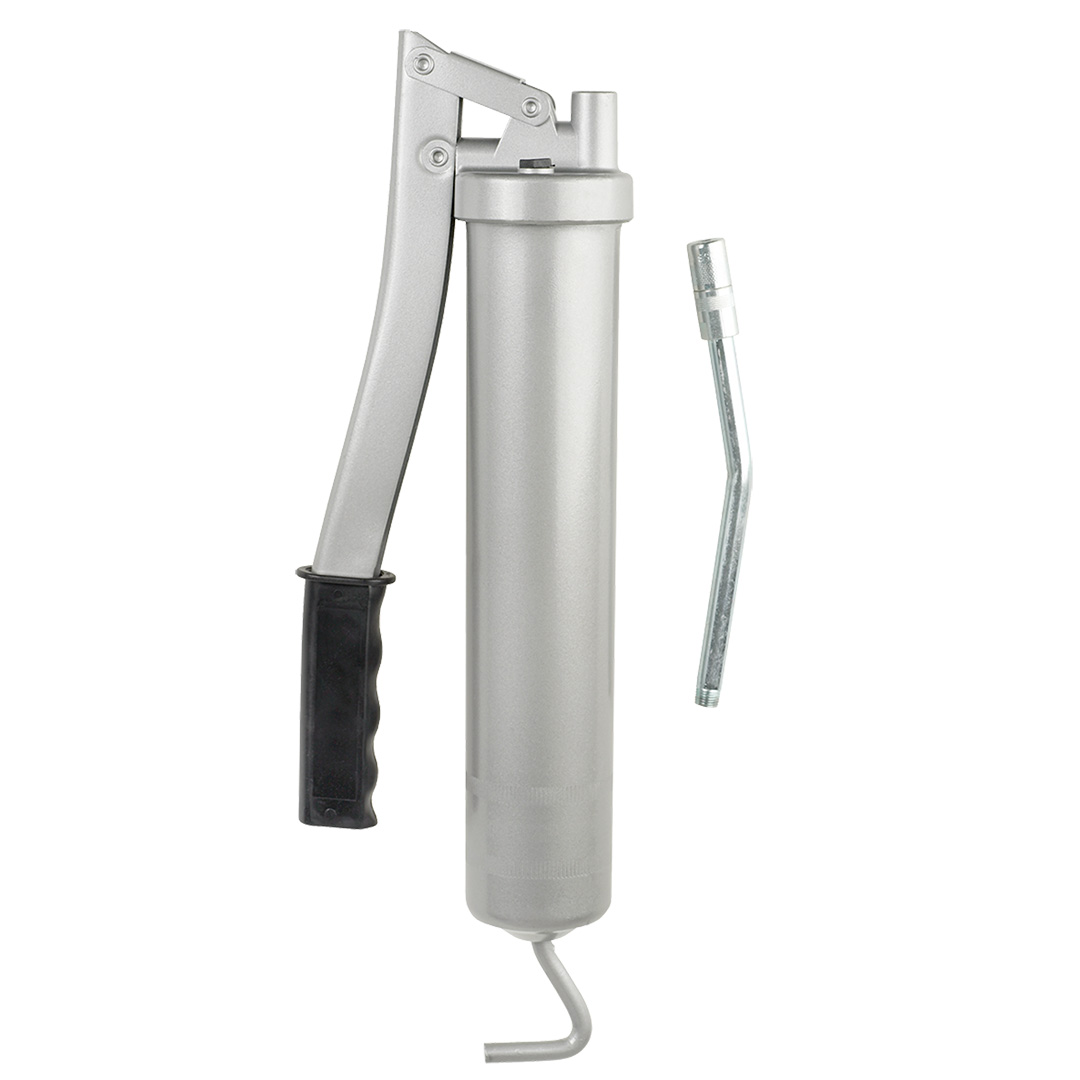 Kézi zsírpisztoly 500 cm3 hajlított csővel és heggyel 12 631 (PRESSOL). NLGI 2-es fokozatig, 20 ° C-on működik. A dugattyú pontosan illeszkedik, ha ömlesztett zsírt vagy patront használ. A szivattyú dugattyúja nagy pontossággal illeszkedik a hengerhez (nincs látszólagos kenés). A teljesítmény változatlan 40 000 működési ciklus után. Zsírpisztoly fej, cink présöntvény Z 410. Biztos a markolat kezelése a mély szalaggörbülések miatt. Biztonságos fogantyú a tolórúdon. Csúszásgátló fogantyú a zsírpisztoly karján. A zárókupak dugattyúrúd-szorítója lehetővé teszi a rugó kézi nyomását az ömlesztett zsír összenyomásához vagy a dugattyú megrongálásához a sérült patronokban. Alacsony erőfeszítés szükséges a kenéshez a kar optimális hatékonysága miatt. Nagy sebességű szellőzés, a zsírpisztoly csőjének félfordulatával.