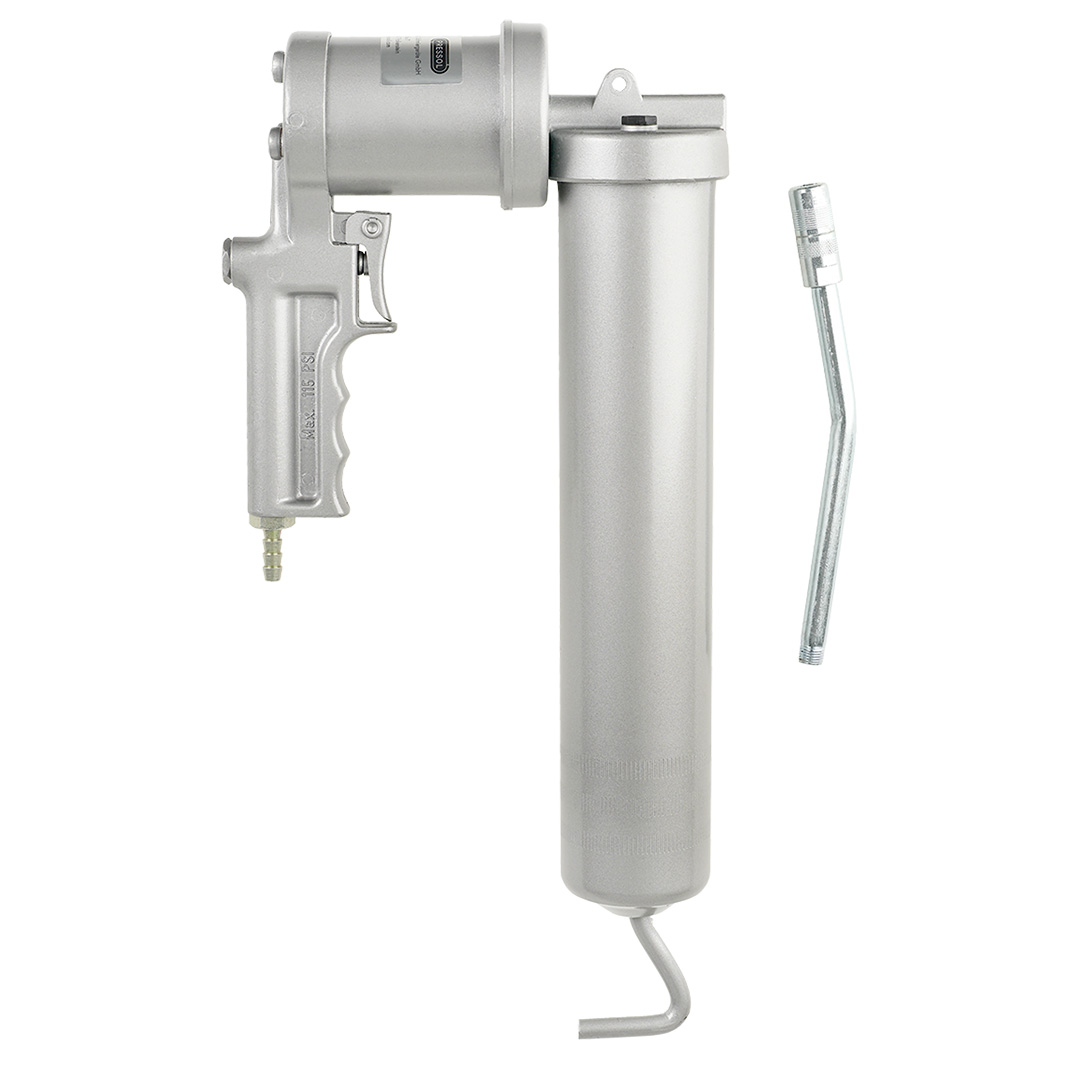 Az 500 cm-es pneumatikus zsírpisztoly (PRESSOL) NLGI 2-es fokozatig 20 ° C-on működik. Dugattyú pontosan illeszkedik, ha ömlesztett zsírt vagy patront használ. A szivattyú dugattyúja nagy pontossággal illeszkedik a hengerhez (nincs látszólagos kenés). A teljesítmény változatlan 40 000 működési ciklus után. Zsírpisztoly fej, cink présöntvény Z 410. Biztos a markolat kezelése a mély szalaggörbülések miatt. Biztonságos fogantyú a tolórúdon. A zárókupak dugattyúrúd-szorítója lehetővé teszi a rugó kézi nyomását az ömlesztett zsír összenyomásához vagy a dugattyú megrongálásához a sérült patronokban. Nagy sebességű szellőzés, a zsírpisztoly csőjének félfordulatával.